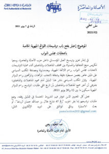 (في إطار تعزيز وترسيخ العمل المؤسساتي داخل حزب الأصالة والمعاصرة، وسعيا لتكريس منهج الشفافية والمساواة بين مختلف المناضلات والمناضلين أثناء عملية الترشيحات لانتخابات مجلس النواب برسم اللائحة الجهوية، وبعدمداولة ومصادقة المكتب السياسي على دليل خاص يتضمن مسطرة دقيقة وشفافة لانتخاب المرشحات والمرشحين برسم الدوائر الجهوية، وقرار المكتب السياسي بنشر هذا الدليل أمام عموم المناضلات والمناضلين؛ يشرفني أن أخبر جميع المناضلات والمناضلين بأنتاريخ تلقي طلبات الترشيح برسم الدوائر الجهوية سيكون ما بين 15 و30 يونيو 2021.