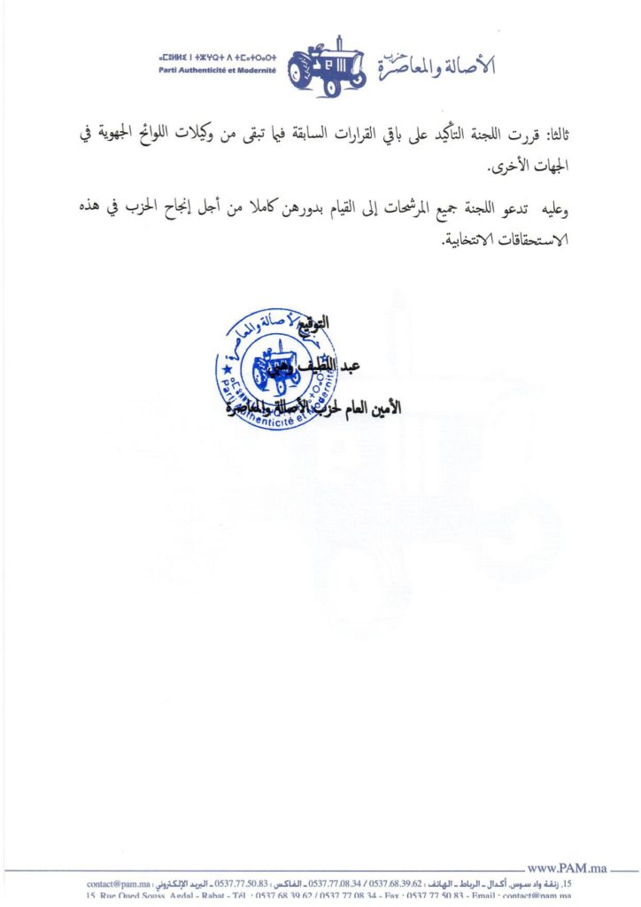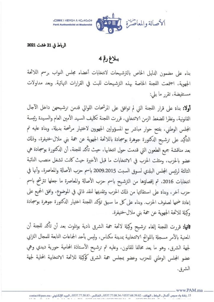 وأكد حزب الأصالة والمعاصرة في بلاغ له أنه بناءً على قرار اللجنة التي لم توافق على المرشحات اللواتي قدمن ترشيحهن داخل الآجال القانونية، ونظرا للضغط الزمن الانتخابي، قررت اللجنة تكليف السيد الأمين العام والسيدة رئيسة المجلس الوطني، بفتح حوار مباشر مع المسؤولين الجهويين لاختيار مرشحة بديلة، وبناءً عليه تم التأكيد على ترشيح الدكتورة جوهرة بوسجادة باللائحة الجهوية عن جهة بني ملال-خنيفرة.