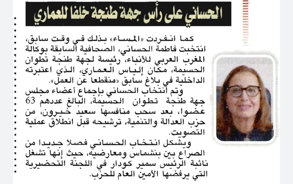 من جهتها تناولت يومية “المساء” الخبر، ونشرت أن فاطمة الحساني، الصحافية السابقة بوكالة المغرب العربي للأنباء، انتخبت رئيسة لمجلس جهة طنجة تطوان الحسيمة، مكان إلياس العماري، الذي اعتبرته الداخلية في بلاغ سابق “منقطعا عن العمل”، بعد سحب منافسها سعيد خيرون ترشيحه قبل انطلاق عملية التصويت.