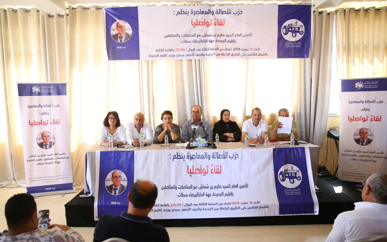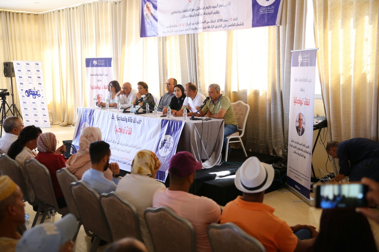 انطلقت، زوال اليوم الأحد 18 غشت 2019 بإقليم الجديدة -جهة الدار البيضاء – سطات، أشغال اللقاء التواصلي، الذي ينظمه حزب الأصالة والمعاصرة، برئاسة الأمين العام السيد حكيم بن شماش مع مناضلات ومناضلي الإقليم.