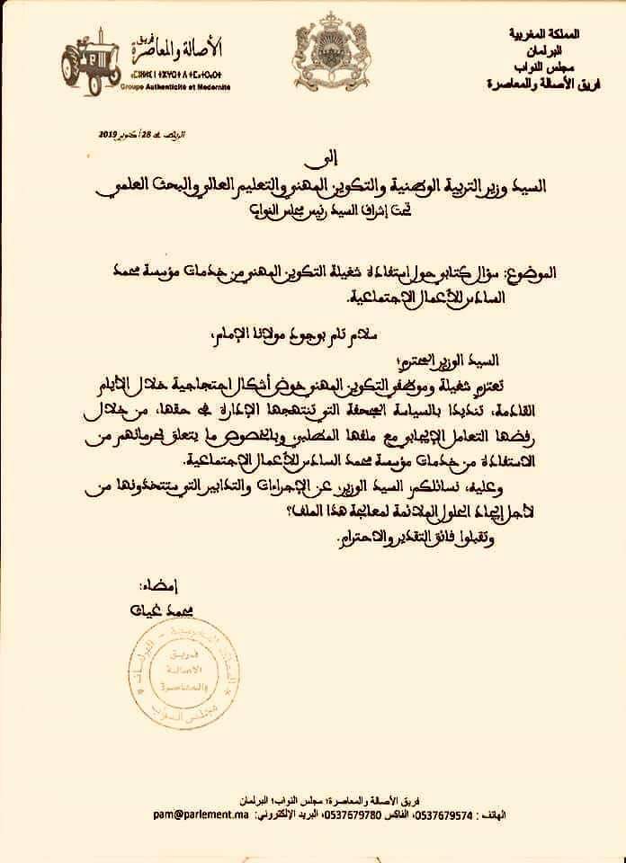 ومن جهة أخرى، أشار النائب البرلماني عن حزب الأصالة والمعاصرة إلى أن شغيلة موظفي التكوين المهني تعتزم خوض أشكال احتجاجية خلال الأيام المقبلة، وذلك تنديدا بالسياسة المجحفة للإدارة من خلال رفضها التعامل الايجابي مع ملفها المطلبي، وبالخصوص ما يتعلق بحرمانهم من الاستفادة من خدمات مؤسسة محمد السادس للأعمال الاجتماعية، مسائلا الحكومة عن الإجراءات والتدابير التي ستتخذها من أجل إيجاد حلول ملائمة لمعالجة هذا الملف المطلبي المشروع.