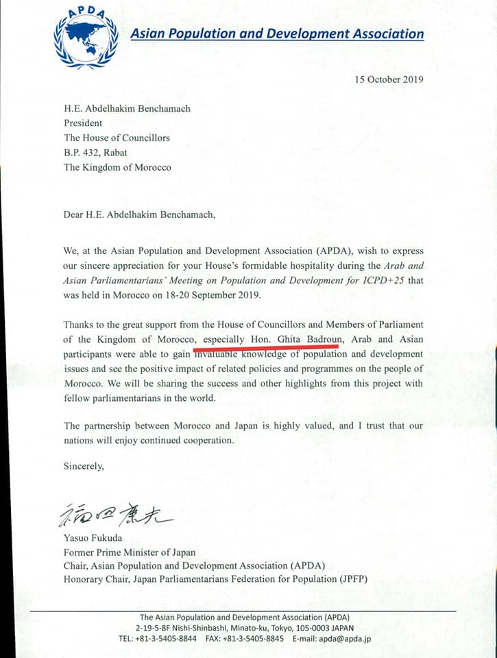 تسلم، مطلع الأسبوع الجاري، السيد حكيم بن شماش، رئيس مجلس المستشارين، رسالة شكر وتقدير، مرسلة من طرف السيد ياسيو فيكيدا، الوزير الأول السابق لليابان ورئيس الجمعية الآسيوية البرلمانية للسكان والتنمية ورئيس الفدرالية البرلمانية اليابانية للسكان، على استضافة ونجاح اجتماع البرلمانيين العرب والآسيويين للسكان و التنمية الذي احتضن المغرب أشغاله من 18 إلى 20 شتنبر 2019 بمجلس المستشارين.