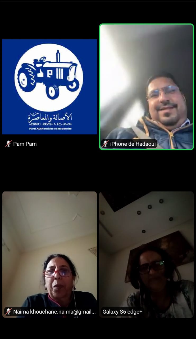 عقدت؛ لجنة المساواة وتكافؤ الفرص التابعة للمجلس الوطني لحزب الأصالة والمعاصرة، برئاسة السيدة نبيلة بنعمر؛ مساء اليوم السبت 23 أبريل الجاري؛ اجتماعاً عبر تقنية “التناظر المرئي”؛ خصص لتدارس الخطوط العريضة لبرنامج عملها السنوي.