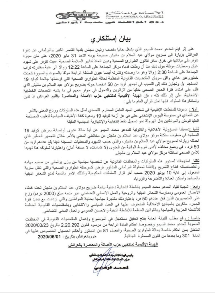 رفعت الهيئة الإقليمية لمنتخبي الأصالة والمعاصرة بإقليم العرائش مطلب للنيابة العامة بفتح تحقيق مستعجل في قيام رئيس مجلس بلدية القصر الكبير والبرلماني عن دائرة العرائش، محمد السيمو، بزيارة إلى ضريح مولاي عبد السلام بن مشيش يوم الأحد 31 ماي 2020 في خرق سافر لقانون الطوارئ الصحية ودون اتخاذ تدابير السلامة الصحية.
