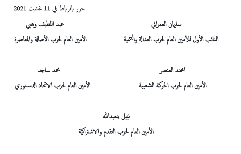 ختاما، وفي سياق الجهود التي تبذلها مختلف الجهات المعنية بتنظيم الانتخابات، خاصة وزارة الداخلية، وما تقوم به من تعبئة استثنائية لأطرها ومؤسساتها في سبيل إنجاح مسلسل الاستحقاقات المقبلة، فإن الأحزاب الموقعة أسفله تلتمس مضاعفة جهود جميع الإدارات العمومية المعنية بالانتخابات خلال الأيام المقبلة، لتمكين المرشحات والمرشحين من جميع الوثائق الخاصة بإيداع ملف الترشيحات في موعده، لاسيما وأن بلادنا أمام تحدي إجراء ثلاثة استحقاقات كبرى في يوم واحد وهي “انتخابات مجلس النواب وانتخابات مجالس الجماعات وانتخابات مجالس الجهات” وما يتطلبه كل ذلك من جهود مضاعفة للإدارات المعنية.