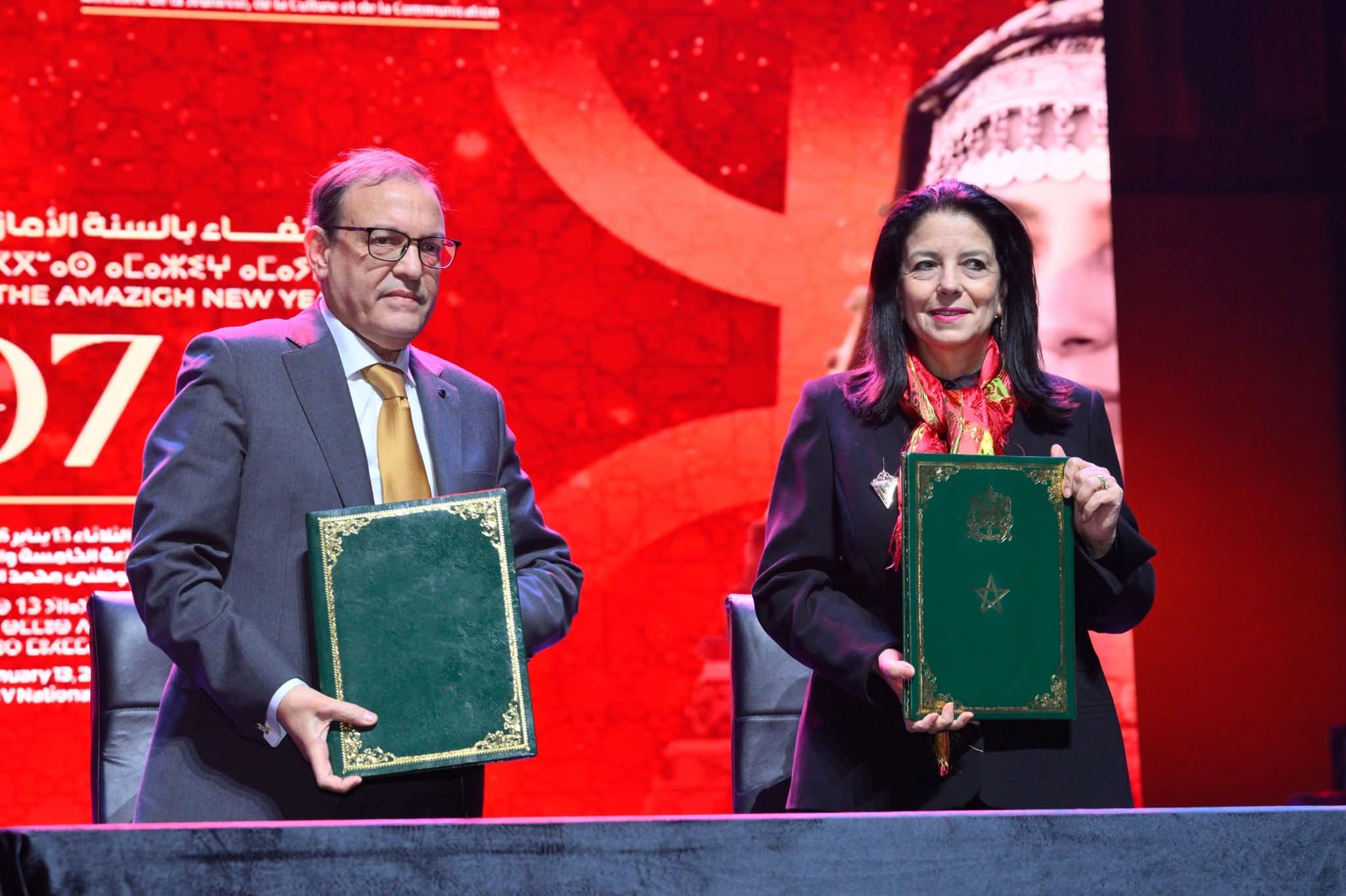 بمناسبة تخليد رأس السنة الأمازيغية الجديدة 2976، نظمت وزارة الانتقال الرقمي وإصلاح الإدارة، ووزارة الشباب والثقافة والتواصل، يوم الثلاثاء 13 يناير 2026، حفلا رسميا بمسرح محمد الخامس، وقعت خلاله السيدة الوزيرة أمل الفلاح السغروشني على أربع اتفاقيات شراكة مع كل من وزارة الانتقال الطاقي والتنمية المستدامة- قطاع الانتقال الطاقي، ووزارة النقل واللوجيستيك ووزارة الاستثمار والتقائية وتقييم السياسات العمومية، والهيئة الوطنية للنزاهة والوقاية من الرشوة ومحاربتها.