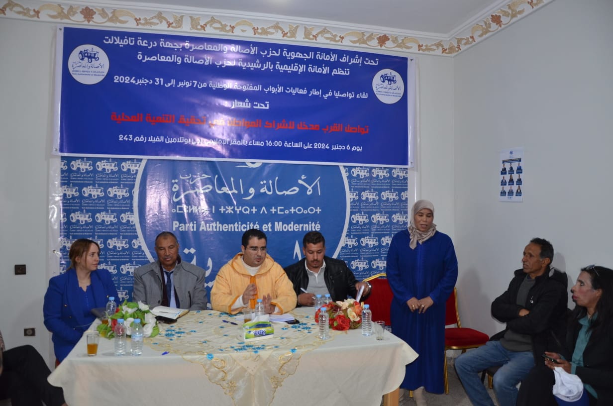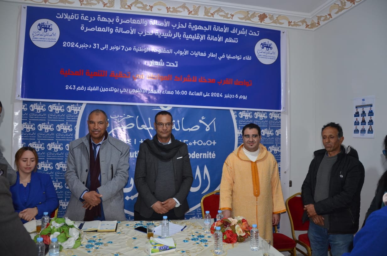 ضمن فعاليات النسخة الأولى للأبواب الوطنية المفتوحة التي أطلقها قطب التنظيم تحت شعار : “تواصل القرب مدخل لإشراك المواطن في تحقيق التنمية”، وتحت إشراف الأمانة الجهوية لحزب الأصالة والمعاصرة بجهة درعة تافيلالت، نظمت الأمانة الإقليمية للحزب بإقليم الرشيدية لقاء تواصليا؛ يوم الجمعة 06 دجنبر 2024 بالمقر الإقليمي للحزب بالرشيدية.