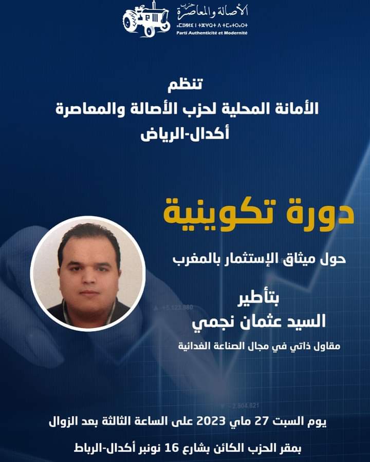 تنظم الأمانة المحلية لحزب الأصالة والمعاصرة أكدال-الرياض بالرباط، يوم السبت 27 ماي الجاري على الساعة الثالثة بعد الزوال بمقر الحزب الكائن بشارع 16 نونبر أكدال (الرباط)، دورة تكوينية حول ميثاق الاستثمار بالمغرب.