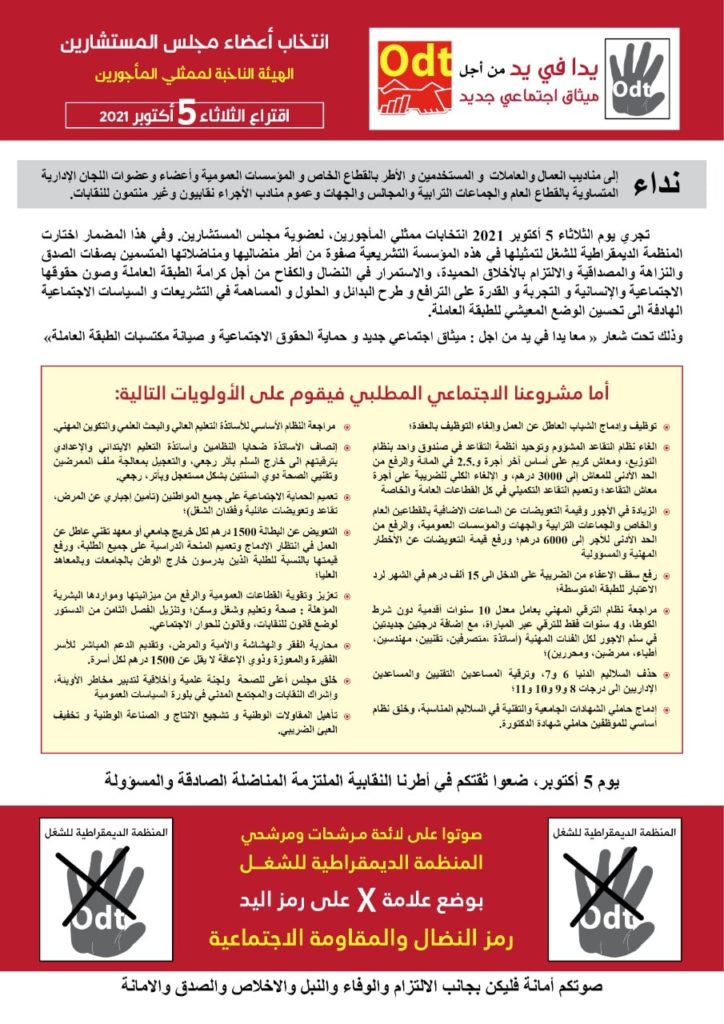 عبد اللطيف وهبي، جميع مناضلات ومناضلي الحزب داخل الهيئة الناخبة لممثلي المأجورين، إلى التصويت بكثافة على لائحة المنظمة الديموقراطية للشغل بوضع علامة على رمز اليد، رمز النضال والمقاومة الاجتماعية.
