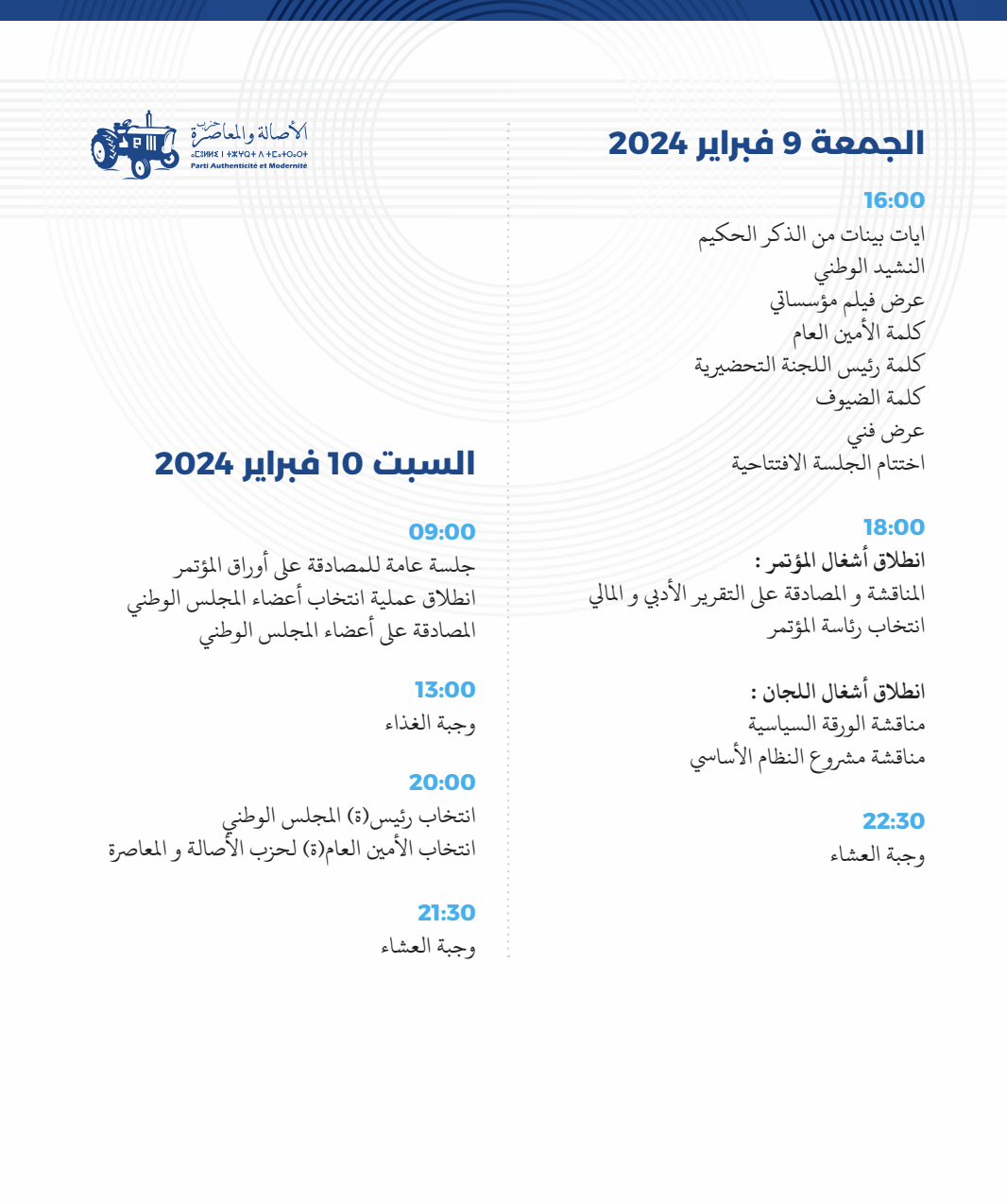 تنعقد؛ أشغال المؤتمر الوطني الخامس لحزب الأصالة والمعاصرة؛ بمدينة بوزنيقة أيام 09- 10- و11 فبراير الجاري؛ تحت شعار: “تجديد الذات الحزبية لضمان الاستمرارية”.
