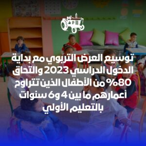 عملت الحكومة على تعميم وتطوير التعليم الأولي باعتباره مدخلا أساسيا لضمان مدرسة الجودة، وقد مكنت الجهود الحكومية المبذولة من توسيع العرض التربوي مع بداية الدخول الدراسي 2023، حيث التحق 80% من الأطفال الذين تتراوح أعمارهم ما بين 4 و6 سنوات بالتعليم الأولي، وتم فتح 4.700 قسم جديد وتوظيف 6.000 مربية ومرب جدد، وتكوين أزيد من 7.100 مربية ومرب، مع انتقال عدد ساعات التكوين الأساس من 400 ساعة إلى 950 ساعة، وتوسيع قاعدة التكوين المستمر.