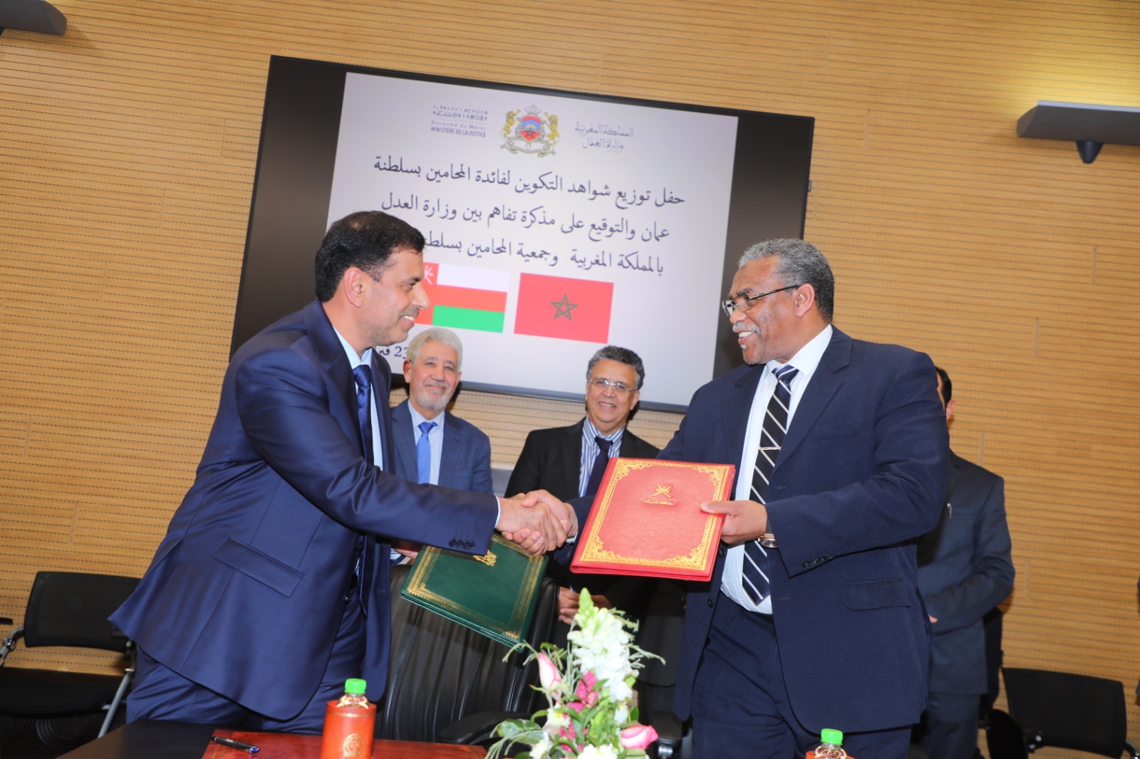 هذا اللقاء شهد التوقيع على مذكرة تفاهم بين وزارة العدل بالمملكة المغربية وجمعية المحامين بسلطنة عمان إلى جانب، توزيع شواهد التكوين لفائدة المحامين بسلطنة عمان.