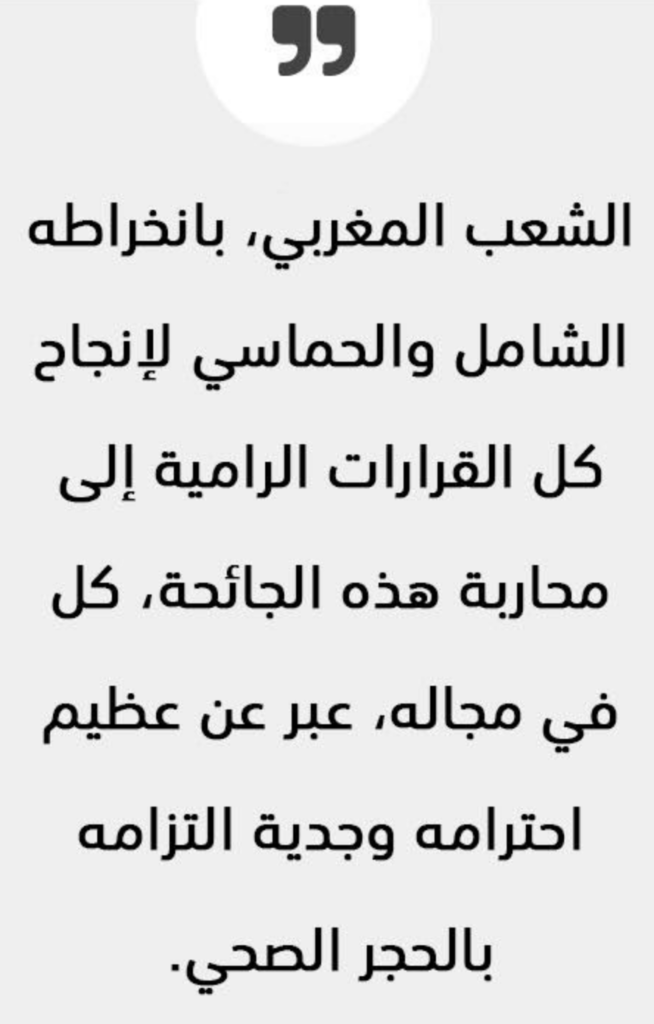 والشعب المغربي، بانخراطه الشامل والحماسي لإنجاح كل القرارات الرامية إلى محاربة هذه الجائحة، كل في مجاله، عبر عن عظيم احترامه وجدية التزامه بالحجر الصحي، وبكل التعليمات التي أعلنتها السلطات الصحية والعمومية، دون أن نغفل دور كل من يقف في الخط الأمامي لمواجهة هذا الوباء بتضحية ونكران للذات من أجل الوطن ولأجل أبناء الشعب.