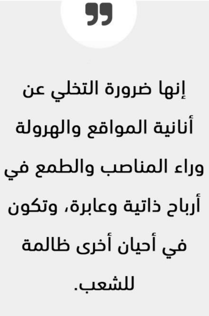إنها ضرورة التخلي عن أنانية المواقع والهرولة وراء المناصب والطمع في أرباح ذاتية وعابرة، وتكون في أحيان أخرى ظالمة للشعب.