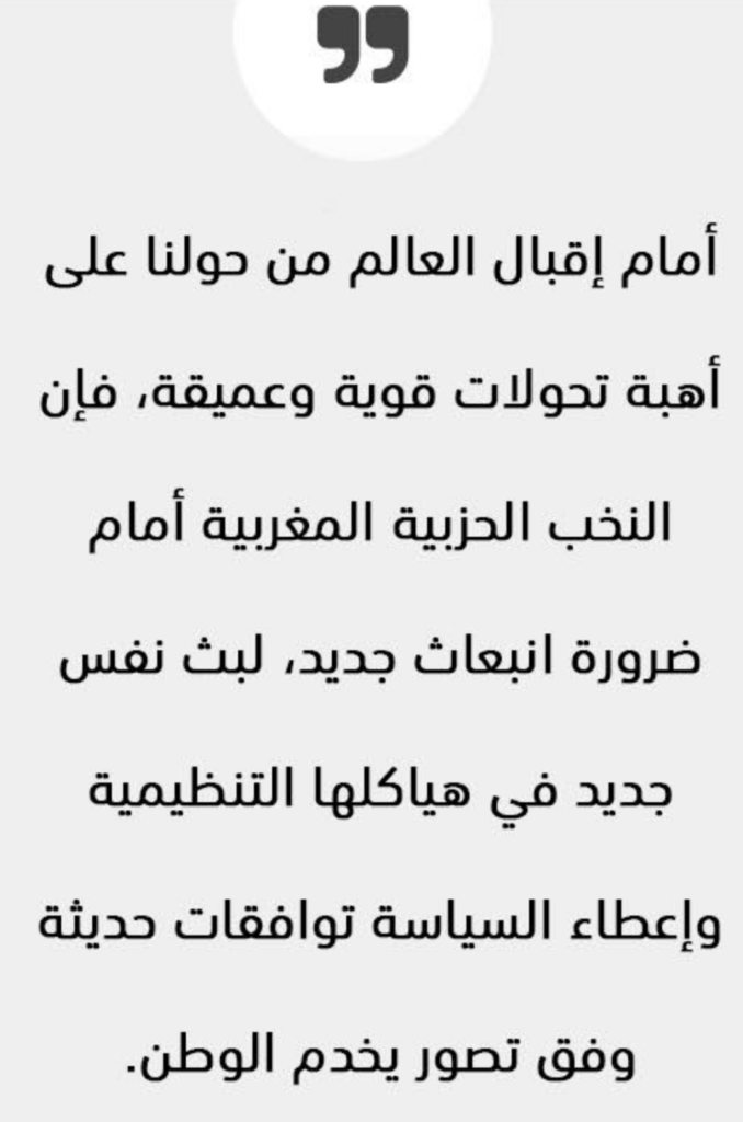وأمام إقبال العالم من حولنا على أهبة تحولات قوية وعميقة، فإن النخب الحزبية المغربية أمام ضرورة انبعاث جديد، لبث نفس جديد في هياكلها التنظيمية وإعطاء السياسة توافقات حديثة وفق تصور يخدم الوطن، وتحليل خلاق للبدائل الاجتماعية.