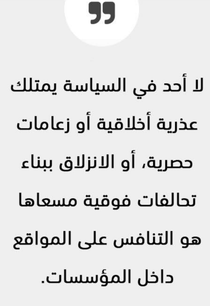 فلا أحد في السياسة يمتلك عذرية أخلاقية أو زعامات حصرية، أو الانزلاق ببناء تحالفات فوقية مسعاها هو التنافس على المواقع داخل المؤسسات، وتحويل هذه الأخيرة إلى عمل إداري روتيني يفتقر لحرارة الواقع والإعمال الفعلي للدستور أو تهميش للقوى السياسية الوطنية الفاعلة لفائدة بعض البيروقراطيين الآتين من عالم المال والأعمال حاملين معهم أرقاما وتصاميم نظرية سرعان ما تهوى أمام عنف الواقع وإلمام السياسي به.