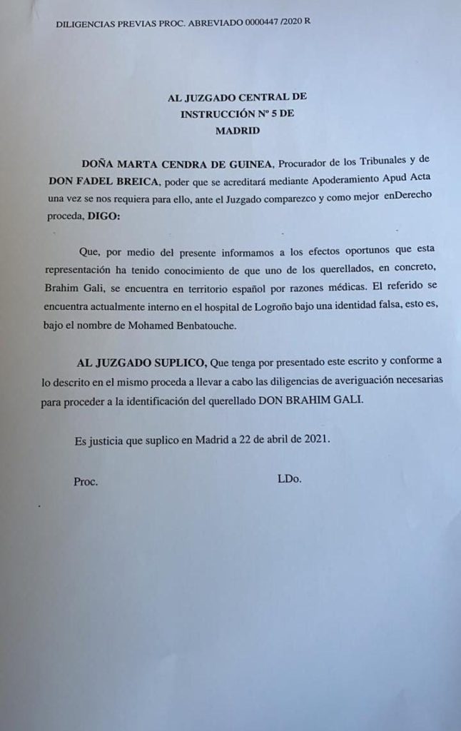 وثيقة رسمية صادرة عن القضاء الاسباني كشفت استدعاء غالي للمثول أمام قاضي التحقيق يوم خامس ماي المقبل، ومعه قيادات الجبهة الانفصالية، وذلك بعد شكاية ضده تقدم بها المدون الصحراوي الحامل للجنسية الاسبانية فاظل بريكة.