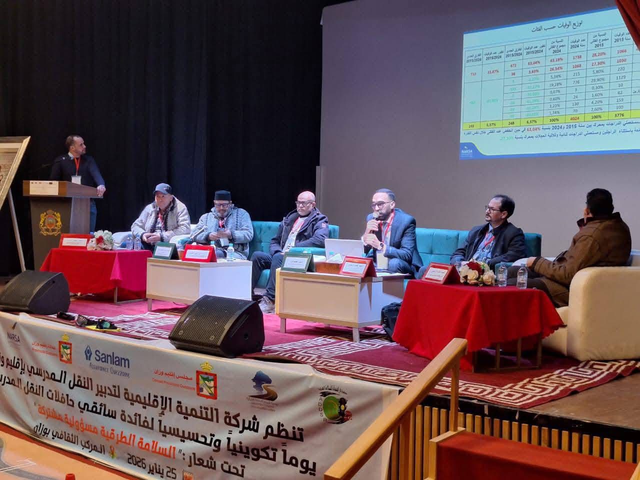 نظمت، شركة التنمية الإقليمية لتدبير النقل المدرسي بإقليم وزان، يوم الأحد 25 يناير 2026، يوما تحسيسيت وتكوينيا لفائدة نحو 170 من سائقي حافلات النقل المدرسي، بالقاعة الكبرى للمركز الثقافي بمدينة وزان، تحت شعار: “السلامة الطرقية مسؤولية مشتركة”، وذلك بتنسيق مع مجلس إقليم وزان وتحت إشراف عمالة الإقليم، وبشراكة مع الوكالة الوطنية للسلامة الطرقية وعدد من الفاعلين الجمعويين والمؤسساتيين.