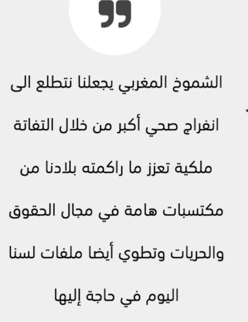 كما أن هذا الشموخ المغربي هو الذي يجعلنا نتطلع أيضا الى انفراج صحي أكبر من خلال التفاتة ملكية تعزز ما راكمته بلادنا من مكتسبات هامة في مجال الحقوق والحريات وتطوي أيضا ملفات لسنا اليوم في حاجة إليها.