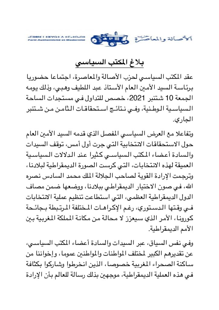 قرر المكتب السياسي لحزب الأصالة والمعاصرة، عقد دورة استثنائية مستعجلة للمجلس الوطني لإشراك السيدات والسادة أعضاء المجلس الوطني في التطورات والمحطة السياسية المستجدة وقرار تموقع الحزب في الاختيارات السياسية المستقبلية.