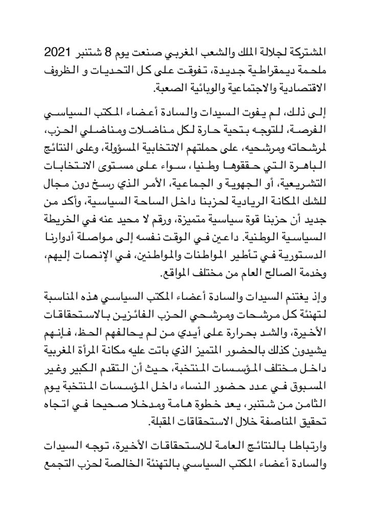 وأورد بلاغ المكتب السياسي، أن السيدات والسادة أعضاء المكتب السياسي يتوجهون بالتهنئة الخالصة لحزب التجمع الوطني للأحرار على احتلاله المرتبة الأولى، متمنين له النجاح في تدبير المرحلة المقبلة، وكذلك مهنئين السيد عزيز أخنوش رئيس حزب التجمع الوطني للأحرار عقب استقباله من طرف صاحب الجلالة الملك محمد السادس نصره الله والذي تفضل وعينه جلالته رئيسا للحكومة، وكلفه بتشكيل الحكومة الجديدة.