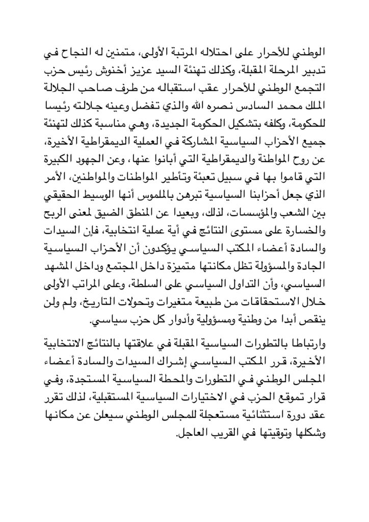 وأكد أعضاء المكتب السياسي، في بلاغ لهم أنه “وارتباطا بالتطورات السياسية المقبلة في علاقتها بالنتائج الانتخابية الأخيرة، قرر المكتب السياسي إشراك السيدات والسادة أعضاء المجلس الوطني في هذه القرارات خلال دورة استثنائية مستعجلة للمجلس الوطني سيعلن عن مكانها وشكلها وتوقيتها في القريب العاجل”.