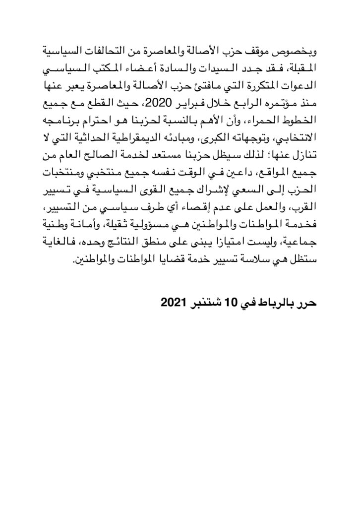 وبخصوص موقف حزب الأصالة والمعاصرة من التحالفات السياسية المقبلة، فقد جدد السيدات والسادة أعضاء المكتب السياسي في بلاغهم، “الدعوات المتكررة التي مافتئ حزب الأصالة والمعاصرة يعبر عنها منذ مؤتمره الرابع خلال فبراير 2020، حيث القطع مع جميع الخطوط الحمراء، وأن الأهم بالنسبة لحزبنا هو احترام برنامجه الانتخابي، وتوجهاته الكبرى، ومبادئه الديمقراطية الحداثية التي لا تنازل عنها؛ لذلك سيظل حزبنا مستعد لخدمة الصالح العام من جميع المواقع، داعين في الوقت نفسه جميع منتخبي ومنتخبات الحزب إلى السعي لإشراك جميع القوى السياسية في تسيير القرب، والعمل على عدم إقصاء أي طرف سياسي من التسيير، فخدمة المواطنات والمواطنين هي مسؤولية ثقيلة، وأمانة وطنية جماعية، وليست امتيازا يبنى على منطق النتائج وحده، فالغاية ستظل هي سلاسة تسيير خدمة قضايا المواطنات والمواطنين”.