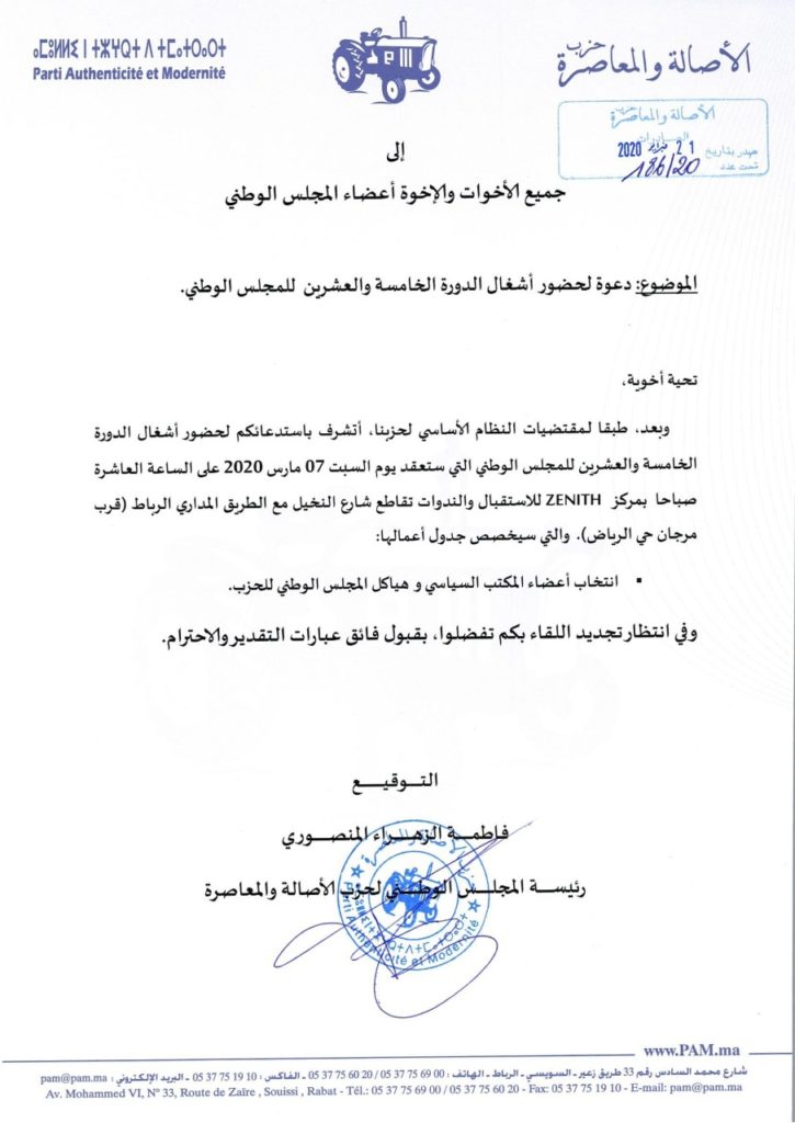 طبقا لمقتضيات النظام الأساسي للحزب، وجهت فاطمة الزهراء المنصوري، رئيسة المجلس الوطني لحزب الأصالة والمعاصرة، دعوة لأعضاء المجلس الوطني لحضور أشغال الدورة الخامسة والعشرين للمجلس الوطني التي ستعقد يوم السبت 7 مارس 2020، على الساعة العاشرة صباحاً بمركز ZENITH للاستقبال والندوات تقاطع شارع النخيل مع الطريق المداري (قرب مرجان حي الرياض).