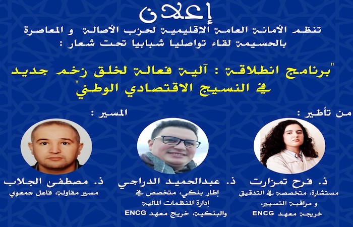 تنزيلا لتوجيهات القيادة الوطنية لحزب الأصالة والمعاصرة، وبالتنسيق مع الأمانة العامة الجهوية للحزب بجهة طنجة تطوان الحسيمة، تنظم الأمانة العامة للبام بالحسيمة، لقــــــــاء تواصليا شبابيا حول موضوع:” برنامج انطلاقة: آلية فعالة لخلق زخم جديد في النسيج الاقتصادي الوطني”.
