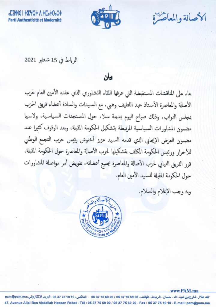 قرر الفريق النيابي لحزب الأصالة والمعاصرة بجميع أعضائه، تفويض أمر مواصلة المشاورات حول الحكومة المقبلة للسيد الأمين العام.