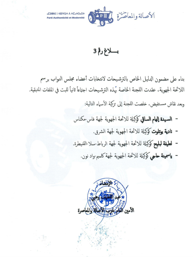 وأكد ذات البلاغ، أنه بعد نقاش مستفيض بين أعضاء اللجنة، خلصوا إلى تزكية، كل من: السيدة إلهام الساقي كوكيلة للائحة الجهوية لجهة فاس-مكناس، والسيدة نادية بوتلوت كوكيلة للائحة الجهوية لجهة الشرق، والسيدة لطيفة لبليح كوكيلة للائحة الجهوية لجهة الرباط-سلا-القنيطرة، والسيدة ياسمينة حاجي كوكيلة للائحة الجهوية لجهة كلميم-واد نون.