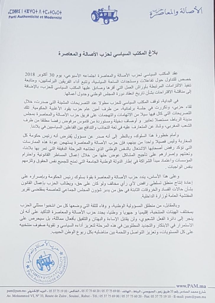 في البداية، توقف المكتب السياسي للحزب مطولا عند التصريحات المشينة التي صدرت، خلال لقاء حزبي، وتكررت في جلسة برلمانية، من طرف أمين عام حزب يقود الأغلبية الحكومية. تلك التصريحات التي كال فيها سيلا من الاتهامات والتهجمات على فريق حزب الأصالة والمعاصرة بمجلس مدينة الرباط، مستعملا تعابير و أوصاف دخيلة ومستوردة من قاموس مرفوض رفضا مطلقا من طرف الشعب المغربي، وشاذ عن المتعارف عليه في لغة التجاذب والتدافع بين الفاعلين السياسيين في بلادنا.