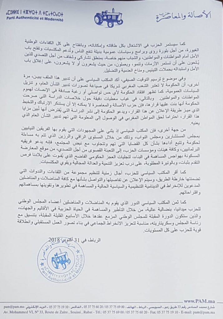 وبالمقابل، من منطلق المسؤولية الوطنية، و وفاء للثقة التي وضعها كل من انتخبوا ممثلي الحزب بمختلف الهيئات المنتخبة، إقليميا و جهويا و وطنيا، يجدد حزب الأصالة والمعاصرة التأكيد على أنه لن ينجر إلى دائرة الفعل الشعبوي، ولن يقابل الإساءة والبهتان والتلفيق بأفعال مماثلة، بل سيحرص على الاستمرار في الابتكار والتجديد المطلوبين في هذه المرحلة لتعزيز أداءه السياسي و تقوية صفوف منتخبيه على كل المستويات، وتعزيز التواصل واللحمة بين مناضليه بكل ربوع الوطن الحبيب.