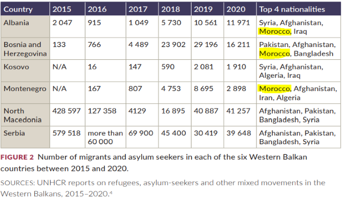 واستنادا إلى التقرير فإن الفترة الممتدة بين عام 2020 سجل 11971 مهاجراً وطالب لجوء في ألبانيا (مغاربة وسوريون وأفغان وعراقيون)، و16211 في البوسنة والهرسك (مغاربة وباكستانيون وأفغان وبنغلاديشيون). وفي الجبل الأسود وصل عددهم إلى 2898 حالة (مغاربة وأفغان وإيرانيون وجزائريون).