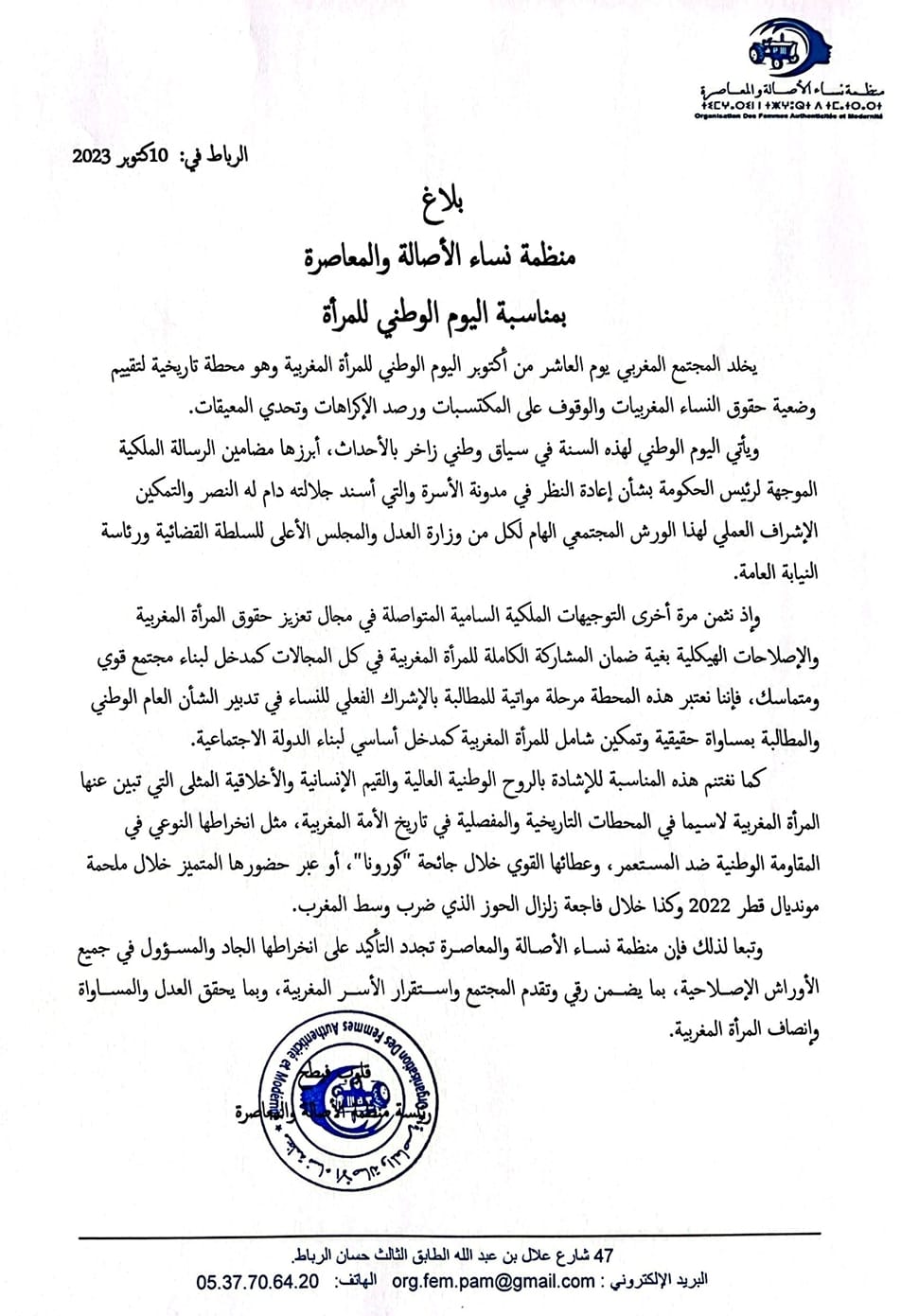 وأكدت المنظمة النسائية في بلاغ لها بمناسبة اليوم الوطني للمرأة المغربية الذي يخلده المجتمع المغربي يوم العاشر من أكتوبر من كل سنة، أن هذا اليوم هو محطة تاريخية لتقييم وضعية حقوق النساء المغربيات والوقوف على المكتسبات ورصد الإكراهات وتحدي المعيقات.