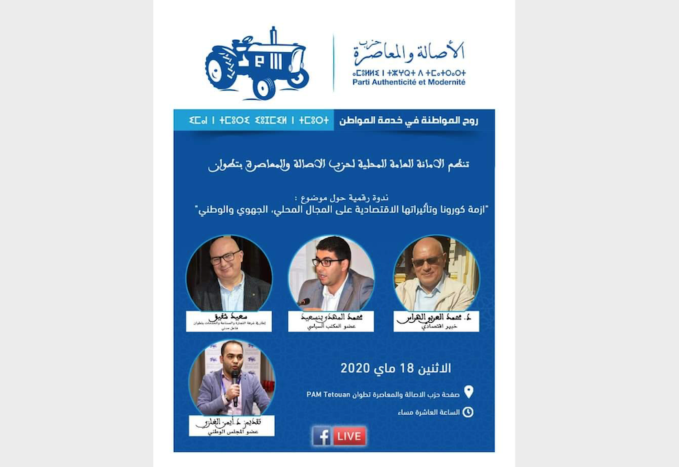 تنظم الأمانة العامة المحلية لحزب الأصالة والمعاصرة بتطوان ندوة رقمية حول موضوع: “أزمة كورونا وتأثيراتها الاقتصادية على المجال المحلي، الجهوي والوطني”، وذلك على الساعة العاشرة مساء من يوم الإثنين 18 ماي 2020.