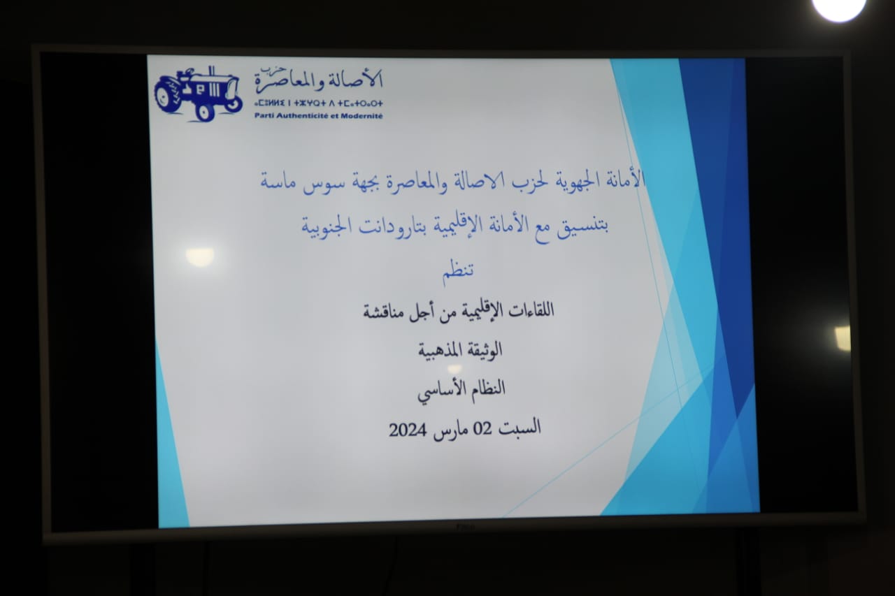 تتواصل سلسلة اللقاءات التشاورية لـلأمانة الجهوية لحزب الاصالة والمعاصرة بجهة سوس ماسة بخصوص مخرجات المؤتمر الوطني الخامس للحزب ومضامين الورقة المذهبية الحزب، وهكذا انعقد يوم الأحد 03 مارس الجاري بمدينة تارودانت، اجتماع إقليمي موسع؛ تحت إشراف الأمين الإقليمي للحزب تارودانت الجنوبية السيد كبور الماسي، وبحضور البرلمانية السيدة حنان الماسي، والسادة الأمناء وأعضاء الأمانات المحلية وأطر الحزب وإدارته الجهوية.