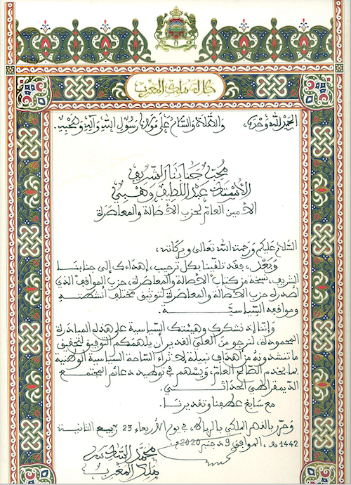 “فقد تلقينا بكل ترحيب، إهداءك إلى جنابنا الشريف، نسخة من كتاب “الأصالة والمعاصرة، حزب المواقف” الذي أصدره حزب الأصالة والمعاصرة لتوثيق مختلف أنشطته ومواقفه السياسية. وإننا إذ نشكرك وهيئتك السياسية على هذه المبادرة المحمودة، لنرجو من العلي القدير أن يلهمكم التوفيق لتحقيق ما تنشدونه من أهداف نبيلة لإثراء الساحة السياسية الوطنية بما يخدم الصالح العام، ويسهم في توطيد دعائم المجتمع الديمقراطي الحداثي”.