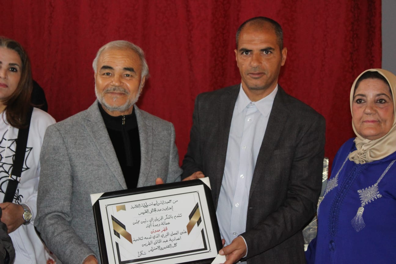 وشهد الحفل حضور لخضر حدوش، رئيس مجلس عمالة وجدة أنجاد، إلى جانب مدير المؤسسة، ورئيسة جمعية آباء وأولياء التلاميذ، إضافة إلى أطر إدارية وتربوية بالإعدادية.