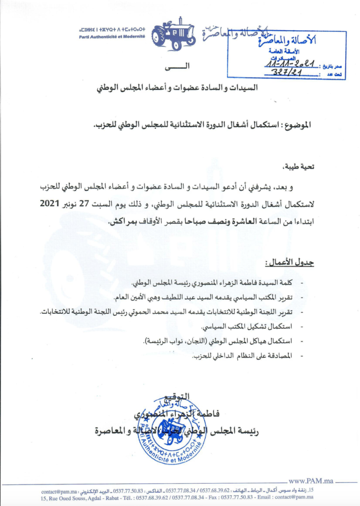 وجهت فاطمة الزهراء المنصوري، رئيسة المجلس الوطني لحزب الأصالة والمعاصرة، دعوة إلى عضوات وأعضاء المجلس لاستكمال أشغال الدورة الاستثنائية، وذلك يوم السبت 27 نونبر 2021 بقصر الأوقاف بمدينة مراكش.