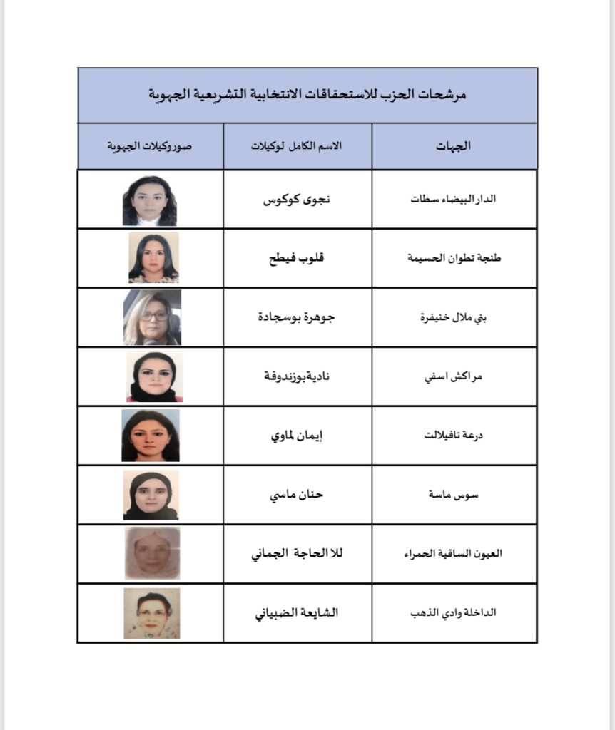 وسيعلن الحزب لاحقا عن باقي مرشحات هذه الاستحقاقات لما تبقى من جهات المملكة.