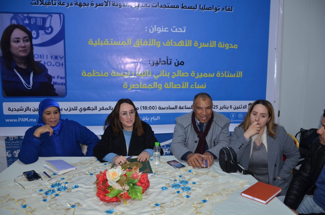 تحت إشراف منظمة نساء الأصالة والمعاصرة وبتنسيق مع الأمانة الجهوية للحزب بجهة درعة- تافيلالت، والأمانة الإقليمية للحزب بالرشيدية، وتحت شعار “مدونة الأسرة: الأهداف والآفاق المستقبلية”.
