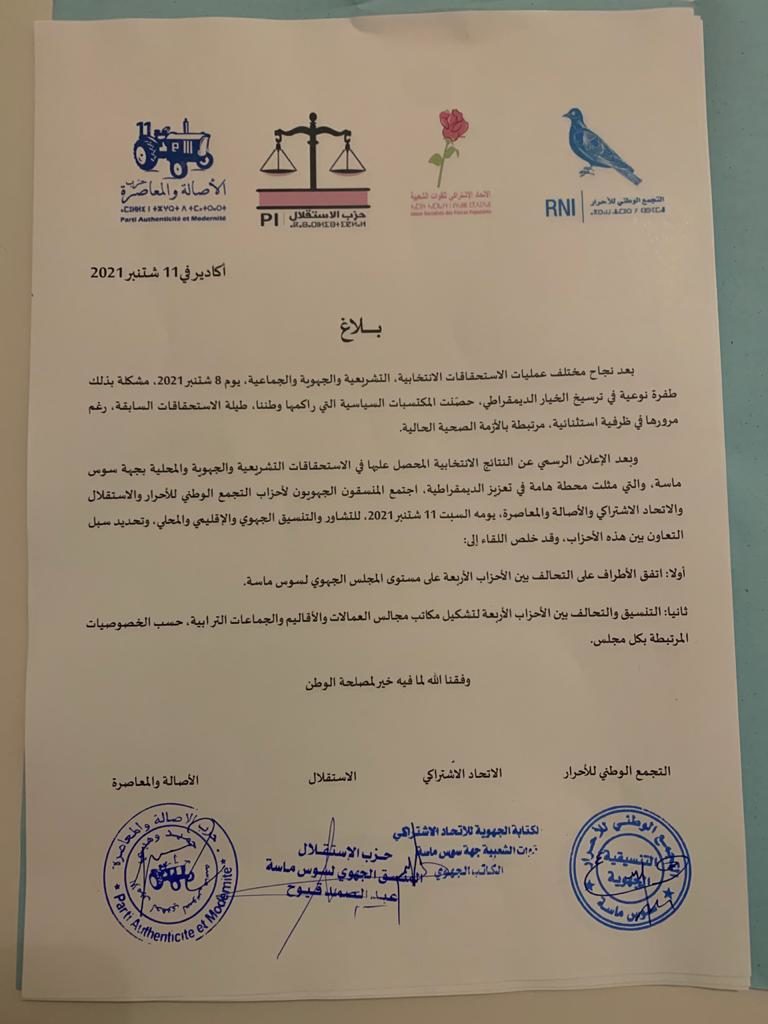 وينص هذا البلاغ في بنوده على التنسيق بين الأحزاب الأربعة على المستوى المحلي والجهوي فيما يخص تشكيل مكاتب الجماعات الترابية.