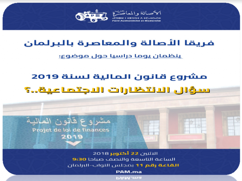 ينظم فريقا الأصالة والمعاصرة بالبرلمان يوما دراسيا حول موضوع “مشروع قانون المالية لسنة 2019: سؤال الانتظارات الاجتماعية”، وذلك يوم الاثنين 22 أكتوبر 2018 ابتداء من الساعة التاسعة والنصف صباحا بالقاعة رقم 11 بمجلس النواب.