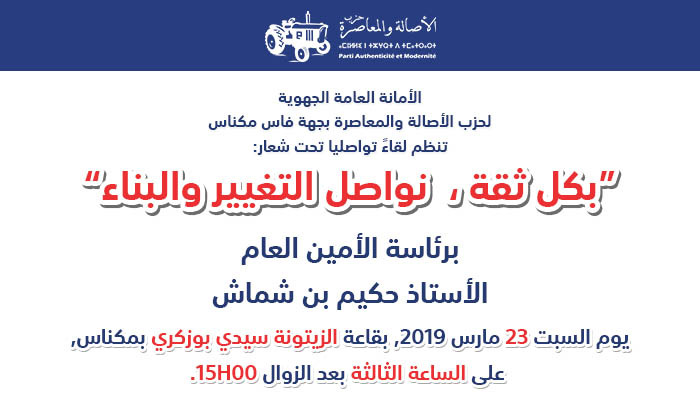 تعقد الأمانة الجهوية لحزب الأصالة والمعاصرة بجهة فاس ـ مكناس، يوم السبت 23 مارس 2019، لقاء تواصليا يترأسه حكيم بن شماش، الأمين العام للحزب، وذلك على الساعة الثالثة بعد الزوال بقاعة الزيتونة سيدي بوزكري بمدينة مكناس.