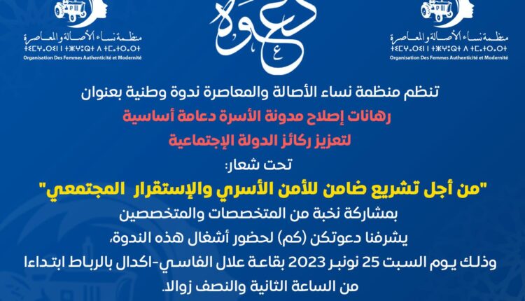 تنظم؛ منظمة نساء الأصالة والمعاصرة؛ ندوة وطنية بعنوان “رهانات إصلاح مدونة الأسرة دعامة أساسية لتعزيز ركائز الدولة الإجتماعية”؛ وتحت شعار: