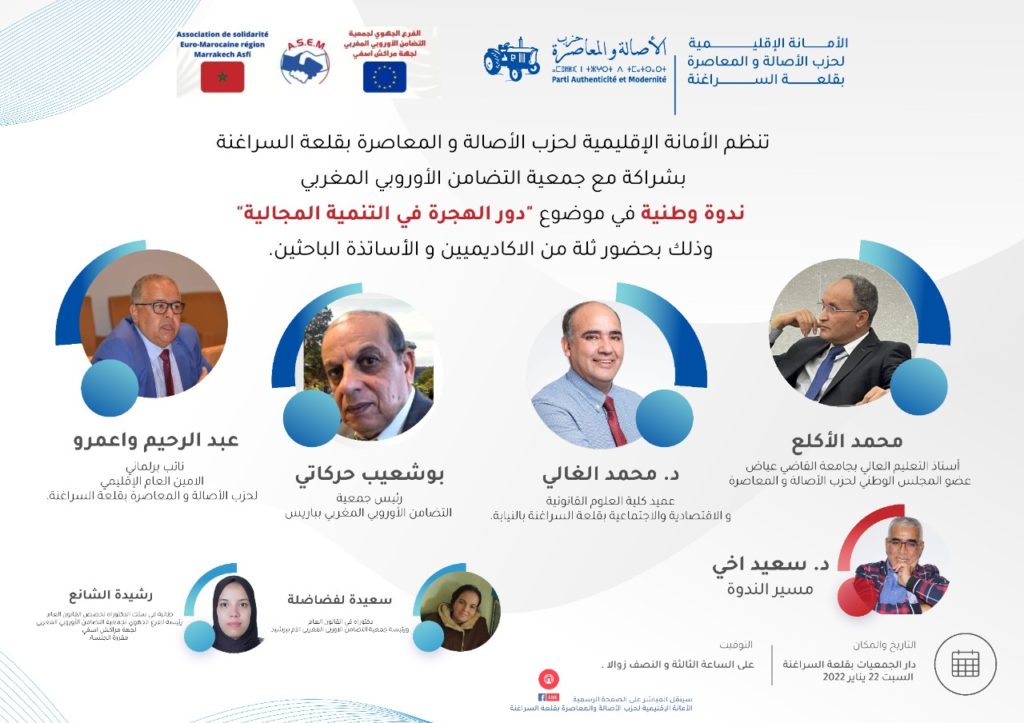 نظمت؛ الأمانة العامة الإقليمية لحزب الأصالة والمعاصرة بقلعة السراغنة؛ بشراكة مع جمعية التضامن الأوروبي المغربي؛ ندوة وطنية في موضوع:” دور الهجرة في التنمية المجالية”؛ وذلك بحضور ثلة من الأكاديميين والأساتذة الباحثين.