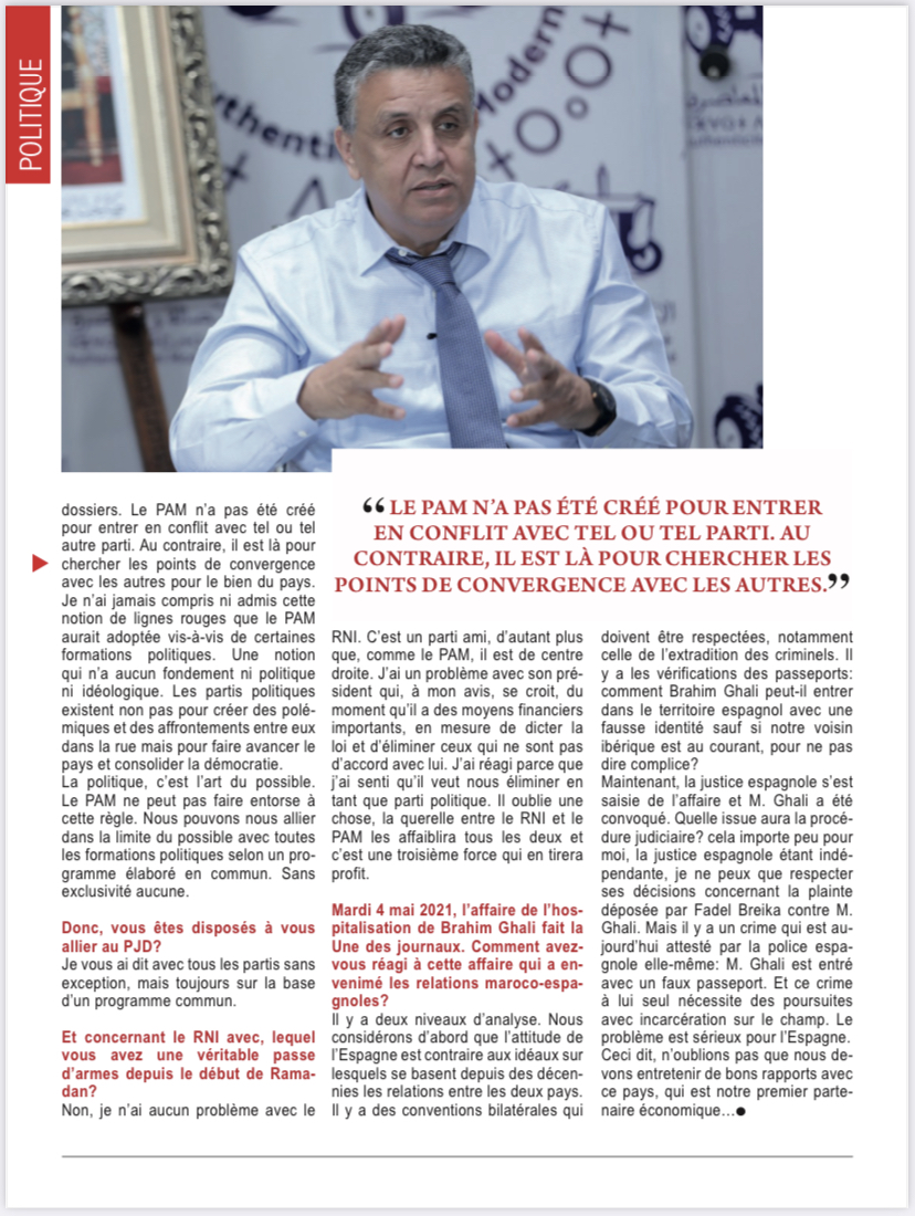 I hereby state having no issues whatsoever with the RNI, for the latter is a friendly party that adopts a central-right approach similar to ours. However, I have an ongoing problem with the way the RNI’s Secretary General approaches politics, for he allows himself to dictate laws and double-cross all those opposed to him, just because he enjoys significant financial means. As PAM’s SG, I was under the obligation of reacting fast, for I sensed his eagerness to get our political party eliminated. What is really sad is that the man in question has failed to realize that the ongoing feud between PAM and RNI will weaken both parties, therefore, other parties are likely to take advantage of the situation.