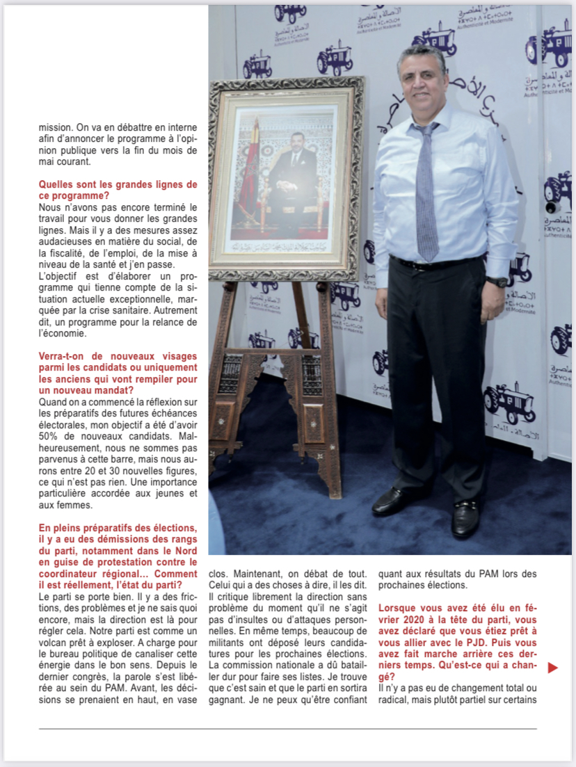 The few changes vis-à-vis our relations with the PJD were neither total, nor radical, but rather partial. PAM never tended to come into conflict with one party or another. On the contrary, our party seeks convergence with other parties for the good of our country. I have never been in favor of PAM’s “red line” notion vis-à-vis certain political parties, for it has no political or ideological foundation. The role of political parties is to contribute to our country’s development and consolidate the latter’s democratic choices, rather than engage in pointless polemics and clashes.