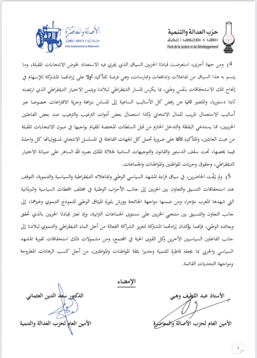 In this regard, both parties shall call upon the competent authorities to intervene accordingly in order to ensure a healthy electoral environment, for we shall all be held responsible before the law, the constitution and HM the king, in respect of Morocco’s democratic choices.